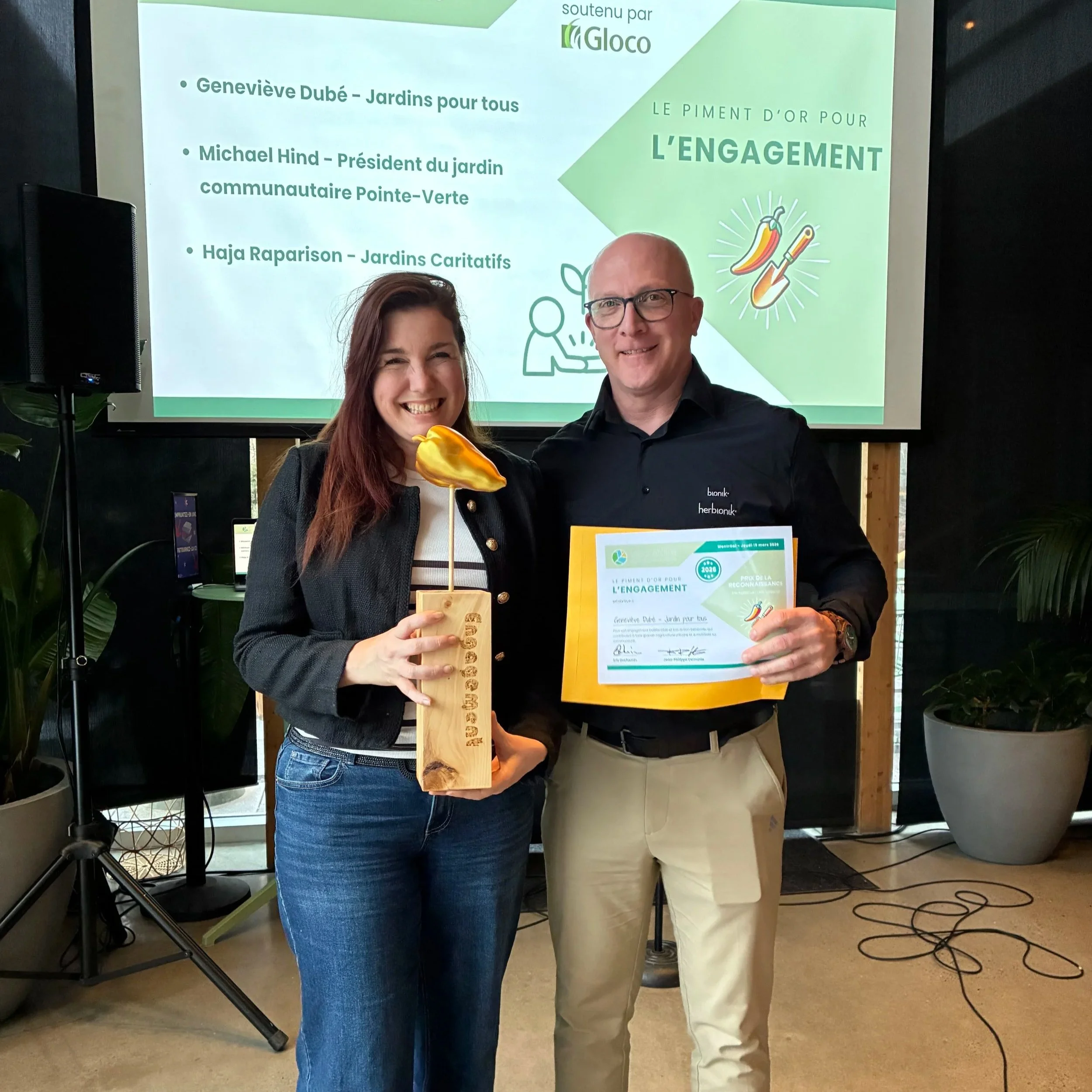 Le piment d’or Engagement 2026 a été remis à Geneviève Dubé pour son engagement social dans le quartier Milton Parc par le biais du projet Jardins pour tous qu’elle a cofondés en 2021. Énergique, en 5 ans, elle a déployé cinq projets d’agriculture urbaine, dont les Jardins du Monde et des Premières Nations. Elle témoigne depuis des années d’un engagement exceptionnel pour le verdissement et l’inclusion.