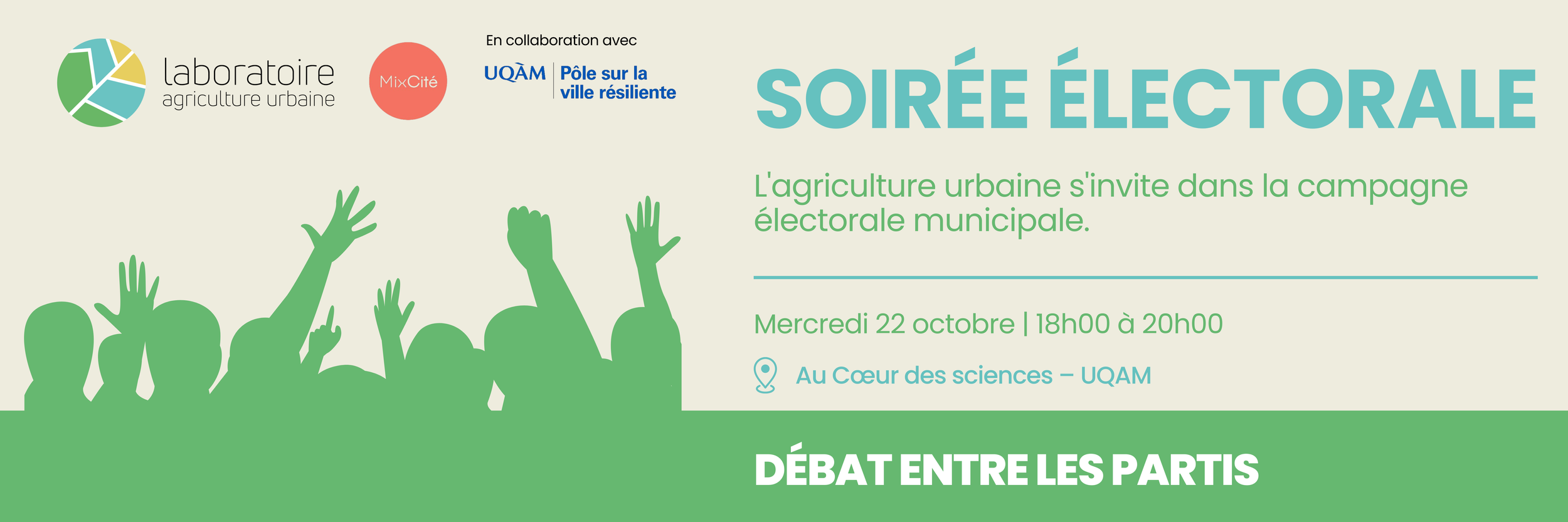Cette soirée électorale est organisée par le Laboratoire sur l'agriculture urbaine en collaboration avec des organismes communautaires montréalais en agriculture urbaine et le Pôle sur la ville résiliente de l'UQAM.